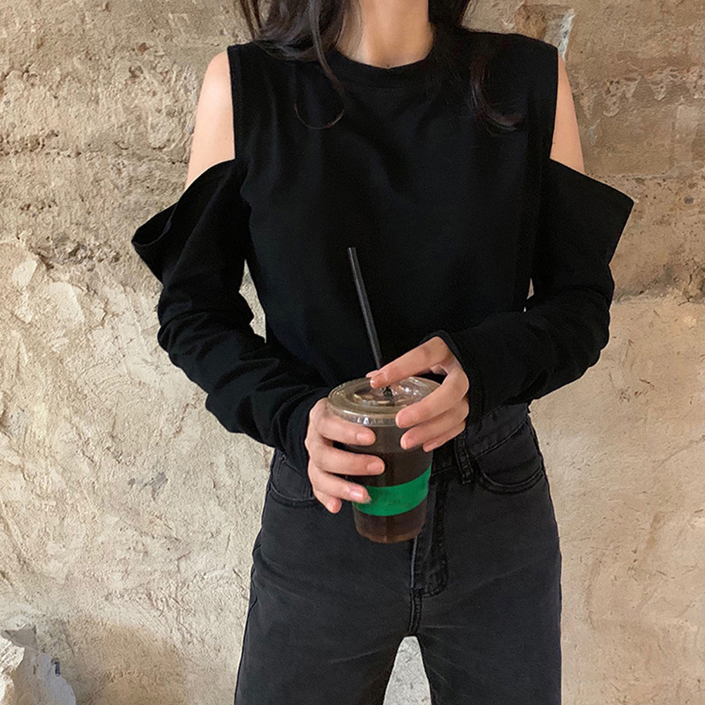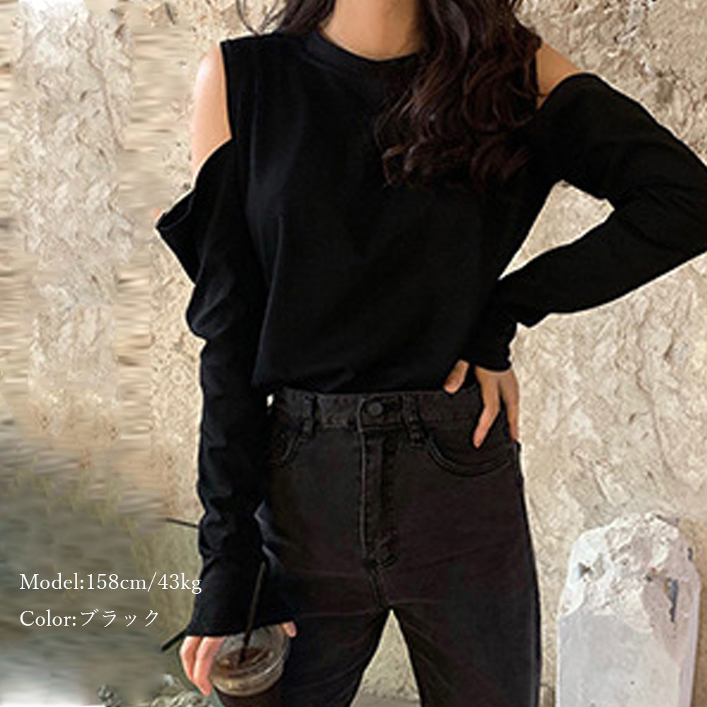 肩開きデザインが女性らしさを演出する長袖トップス。